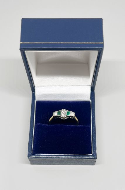 An 18ct yellow gold emerald and diamond set ring, size O, approx 2.7g.
