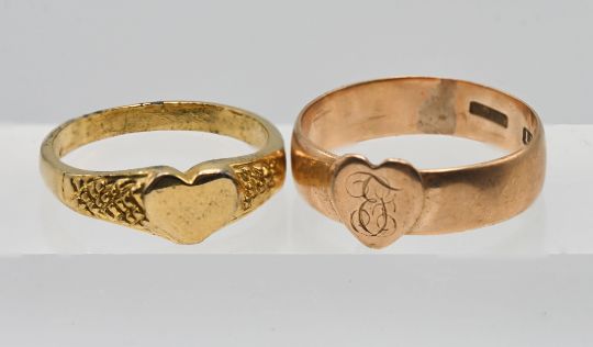 Antique 15ct heart motif ring, approx 3g together with another similar ring (not marked) 2.6g (2)
