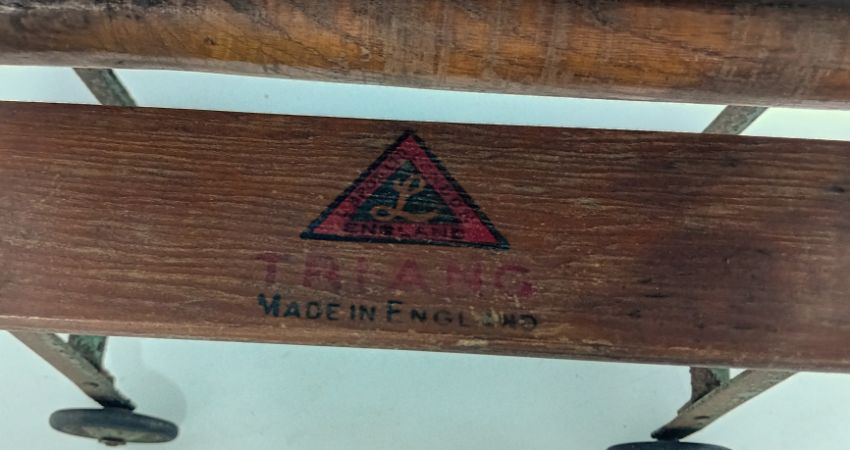 A toy mangle by Triang, wood rollers with painted metal frame, original painted label, height 49cm.