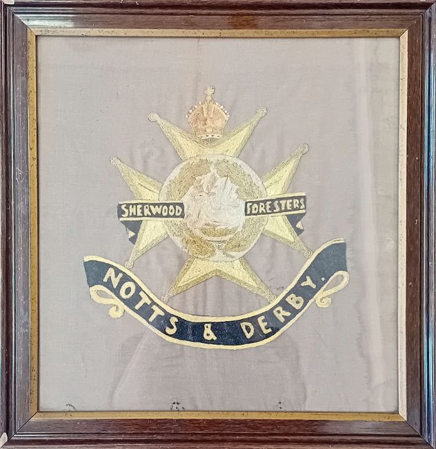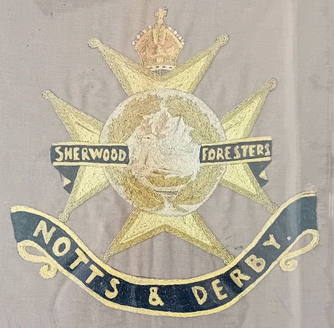 A large embroidered study of the Sherwood Foresters cap badge, completed by Pte. Arthur Elkington while at hospital in recovery after the Battle of the Somme, c.1916, framed and glazed, overall size 45cm x 44cm.