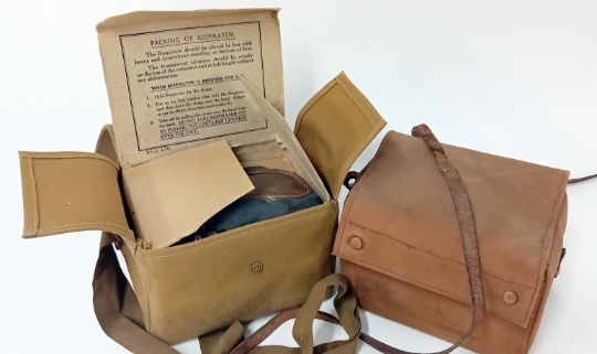 Two WWII civilian gas masks, in card inner boxes and canvas case. (2)