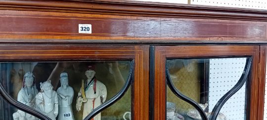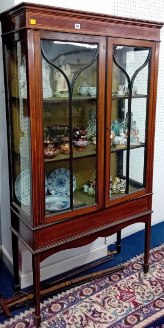 An Edwardian mahogany inlaid two door display cabinet, on square tapered legs with spayed feet. Width 92cm.