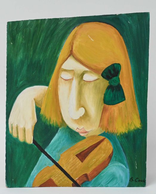 Beryl Cook O.B.E. (British, 1926-2008) oil on board, 'Playing the Violin', signed 'B.Cook' bottom right, 43cm x 36cm.