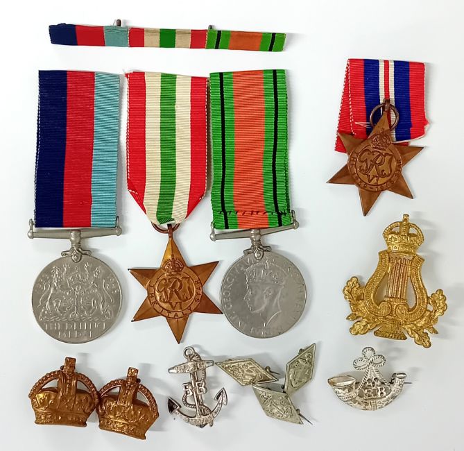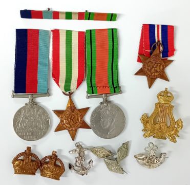 A WWII Trio of medals, to include the George VI Italy Star, The Defence Medal, and War Medal, with ribbon band, together with the 1939-1945 star, a Lyre cap badge, 'Sure and Steadfast' pins, etc.