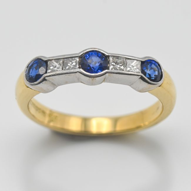 A diamond and blue sapphire ring, set in 18ct yellow gold, size O, approx 4.7g