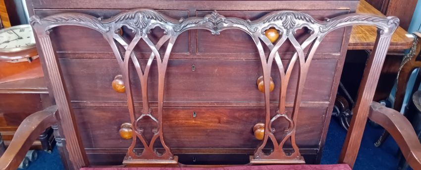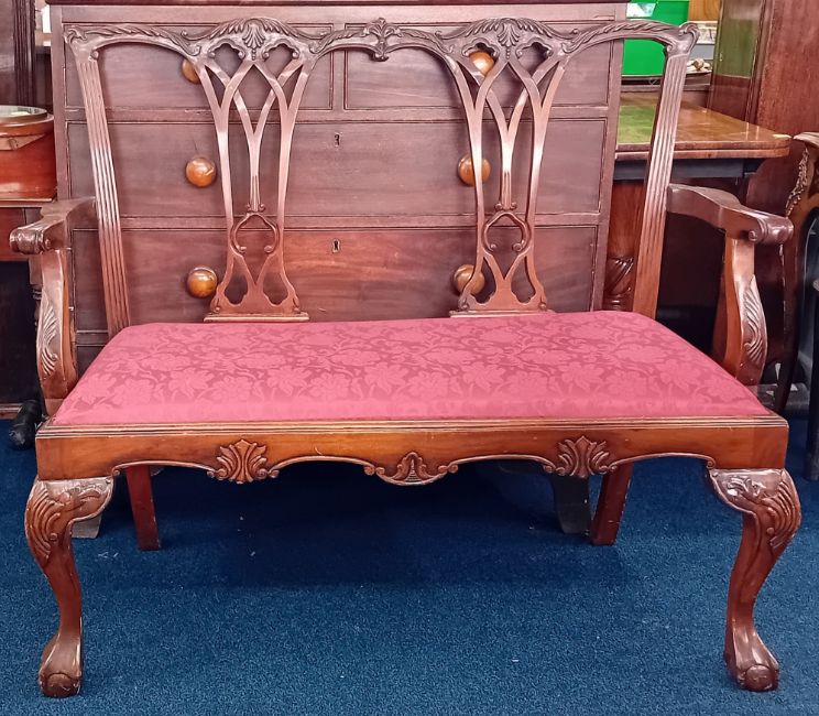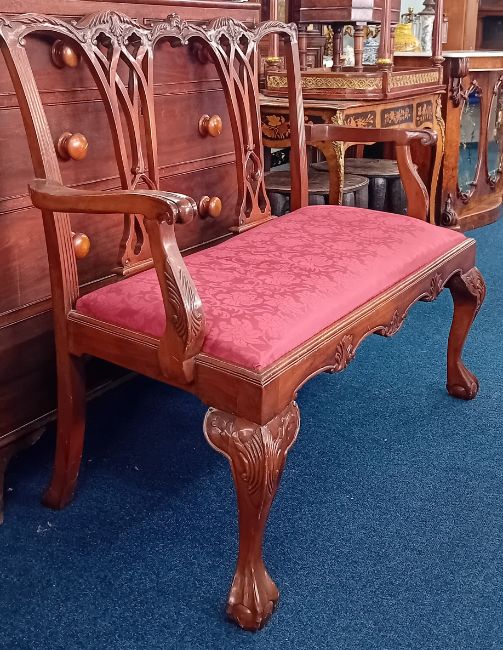 A modern George III Chippendale style double seat, carved pierced splats, upholstered red seat on ball and claw feet, width 117cm.