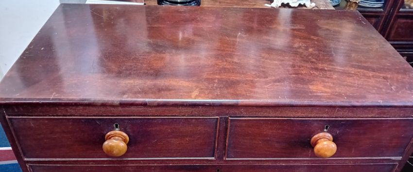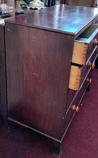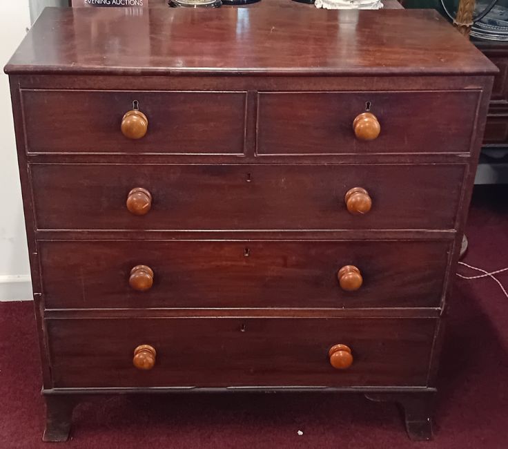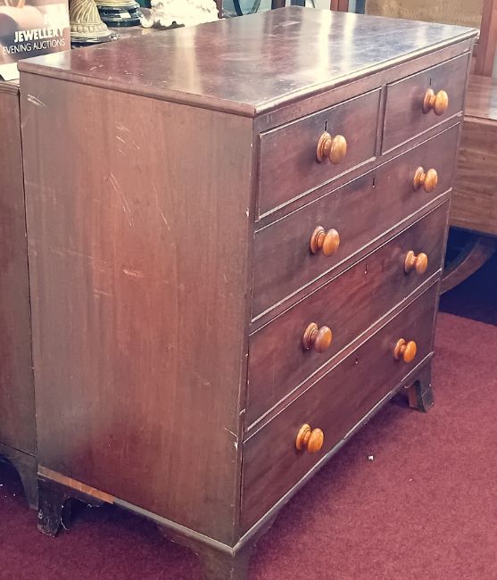 A 19th century mahogany chest of drawers fitted with two short and three long drawers with knob handles on turned bun feet.