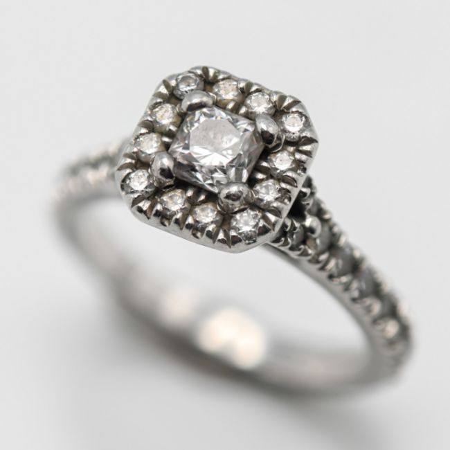 A diamond 'Square' shape cluster ring, set with further diamonds to the shoulders, approx 0.32ct, colour H, clarity VS2, size G, with copy of diamond document, purchase receipts. Purchased from BeaverBrooks in 2018 for £3,800.00.