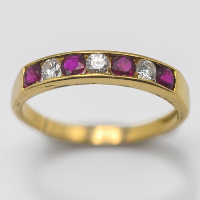 A ruby and diamond half eternity ring, set in 18ct yellow gold, size S, approx 3.4g.