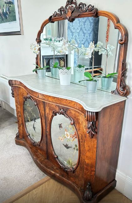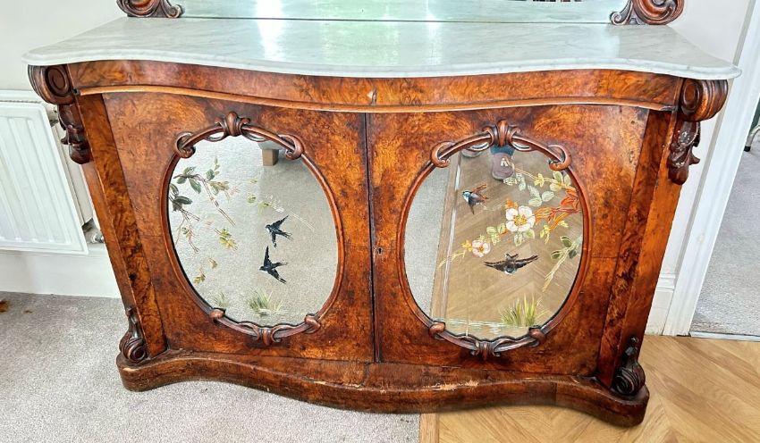 A Victorian walnut burr sideboard, white marble surface with mirror, two oval mirrors to cabinet doors with painted swallow and bluebird floral decoration (some flaking), width 130cm, counter height 87cm.