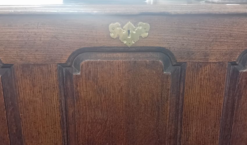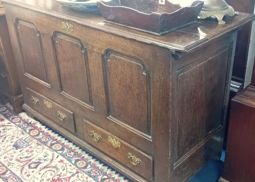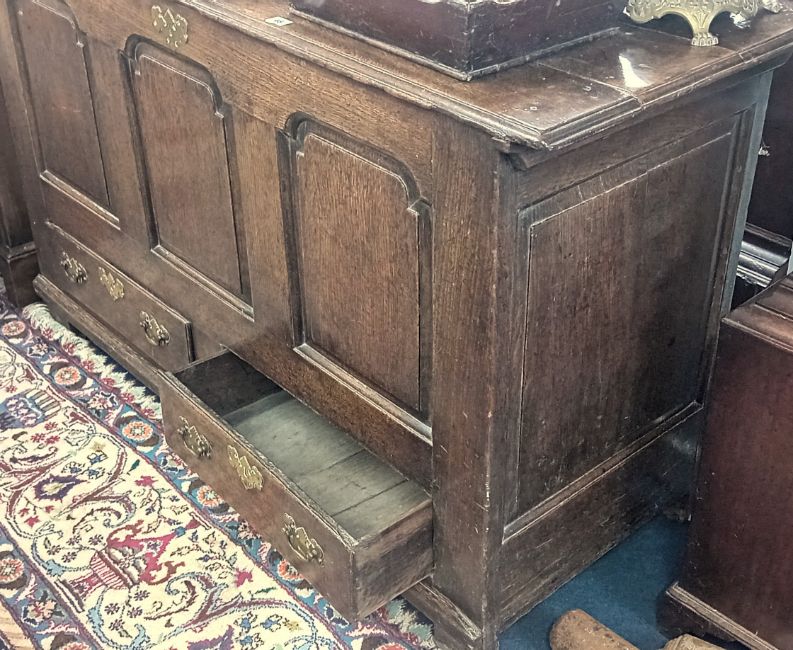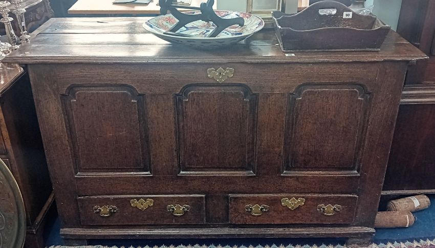 An 18th century oak mule chest with three moulded panels over two drawers fitted with brass plate handles.