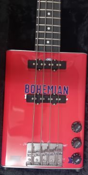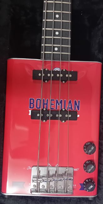 A Bohemian Bass Guitar, made from an oil tin, cased.