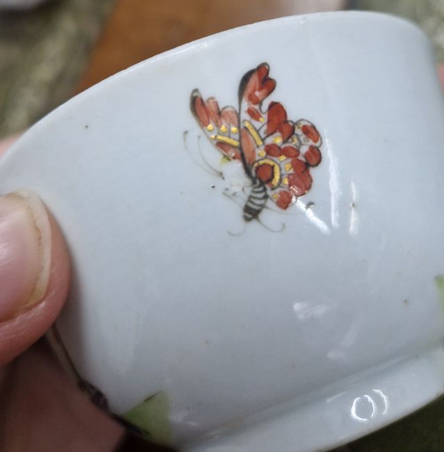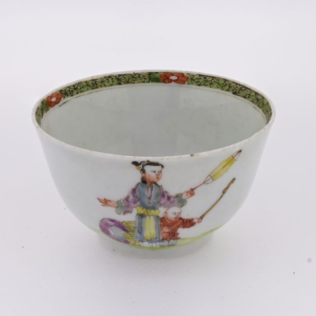 An early Worcester tea bowl decorated in 'Three Musicians' pattern, circa 1756-60, together with another Worcester tea bowl of octagonal form, decorated in monochrome floral motifs. (2)
