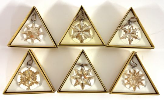 Swarovski Crystal Glass, a collection of six SCS Christmas stars including 2011, 2013, 2012, 2015, 2014, 2009, all boxed (2013, 2012, 2014 and 2009 boxes damaged).